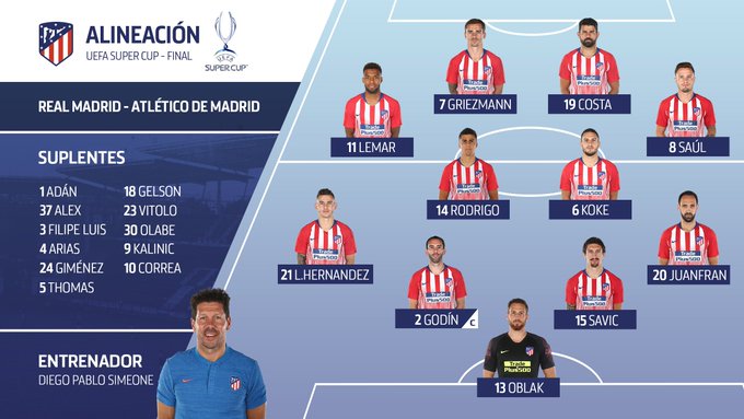 Atlético Madrid. Keylor Navas staat in doel bij Real. Thibaut Courtois staat niet op het wedstrijdblad, want hij is niet speelgerechtigd.