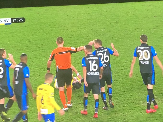 De scheids wordt na een nochtans correcte beslissing belaagd in minuut 72 door de halve ploeg. De scheids fluit penalty in minuut 75. #IntimidatieWerkt #clustv #CluStvv