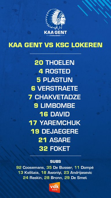 AA Gent: Thoelen - Plastun - Rosted - Asare - Foket - Verstraete - Dejaegere - Chakvetadze - Limbombe - David - Yaremchuk