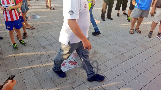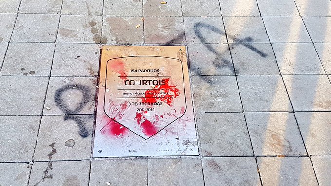 De fans van Atlético pikken het niet dat Courtois aan de slag gaat bij aarstrivaal Real. Op de persoonlijke tegen van de doelman werd met grafiti “rat” gespoten. Er waren ook mensen die spuwden op het plakkaat. Het ging zo ver dat twee mensen van de security voor de tegel plaatsnamen.